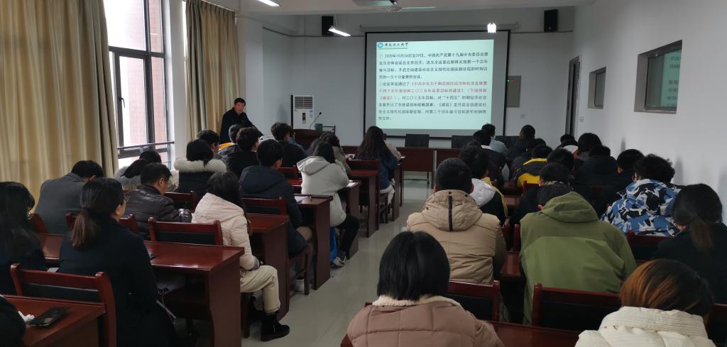 孙功教授从党的十九届五中全会的召开背景、主要成果、起草情况、突出特点和亮点、大会的主要内容、核心要义和加强党的全面领导等七个方面对党的十九届五中全会精神作了全面解读。我国全面建成小康社会取得的决定性成就增强了师生们走中国特色社会主义发展道路的责任感、使命感和自信心。孙功教授结合具体实例,说明了当前我国发展仍处于重要战略机遇期,鼓励大家用发展的眼光认识和把握国内外大势。