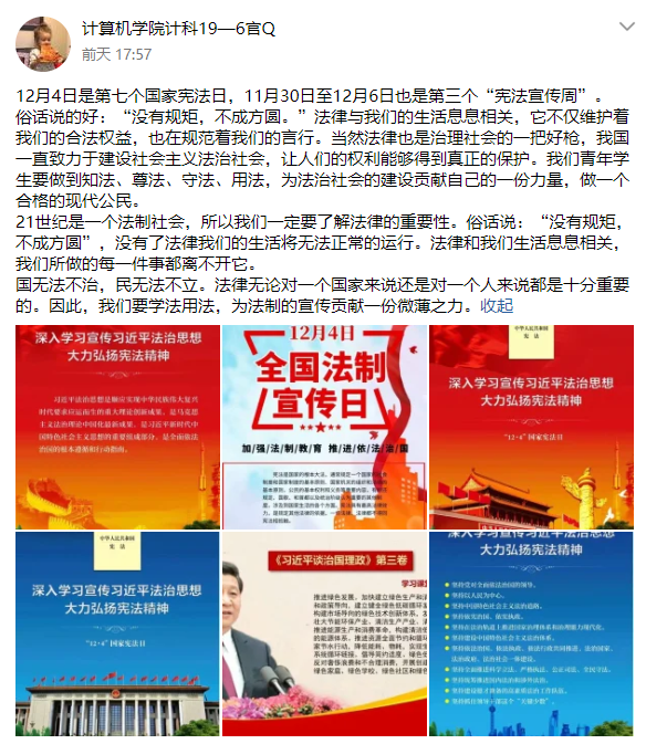 12月4日是第七个国家宪法日,11月30日至12月6日也是第三个全国“宪法宣传周”。为增强全院学生的宪法意识,弘扬宪法精神。12月4日至12月6日,计算机学院组织全体学生通过集体学习、班级宣讲、网上观看视频等方式开展宪法宣传周系列活动。