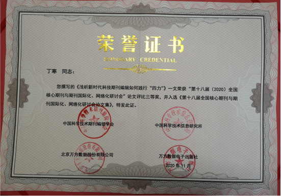 此次研讨会开展了论文征集活动,评选60多篇优秀论文,我校学报编辑丁寒的论文《浅析新时代科技期刊编辑如何践行“四力”》一文荣获大会论文评比三等奖,并入选《第十八届全国核心期刊与期刊国际化、网络化研讨会论文集》。