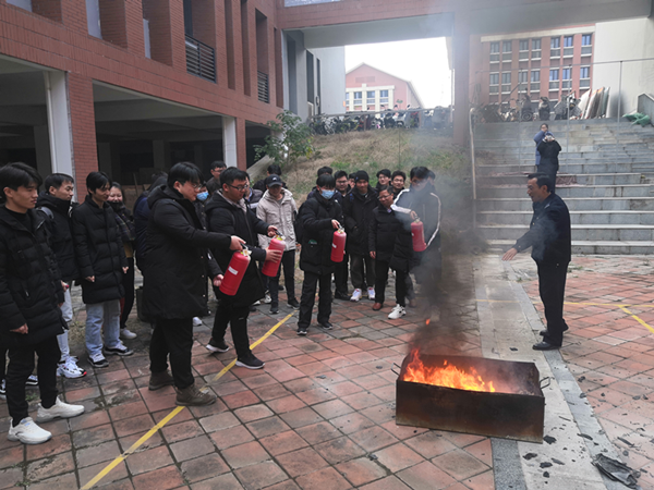 培训结束后,在彭广峰和陈伟两位老师的指导下,老师和同学们演练了遇火灾的逃生方法,在室外开展了现场使用灭火器灭火的演练。