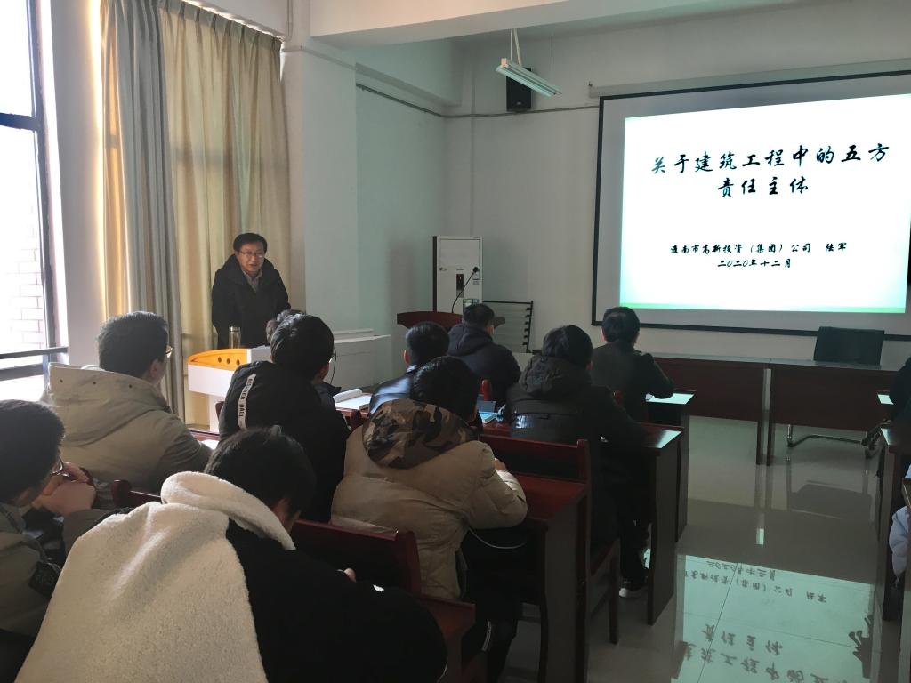 12月16日下午,应自然科学处和力学与光电物理学院邀请,淮南市高新投资(集团)有限责任公司董事长陆军来力物学院作学术交流,并在院报告厅作题为《建筑工程实施过程中的五方责任问题》的学术报告。报告会由院长经来旺教授主持,部分青年教师以及工程力学专业本科生共计80余人参加了报告会。