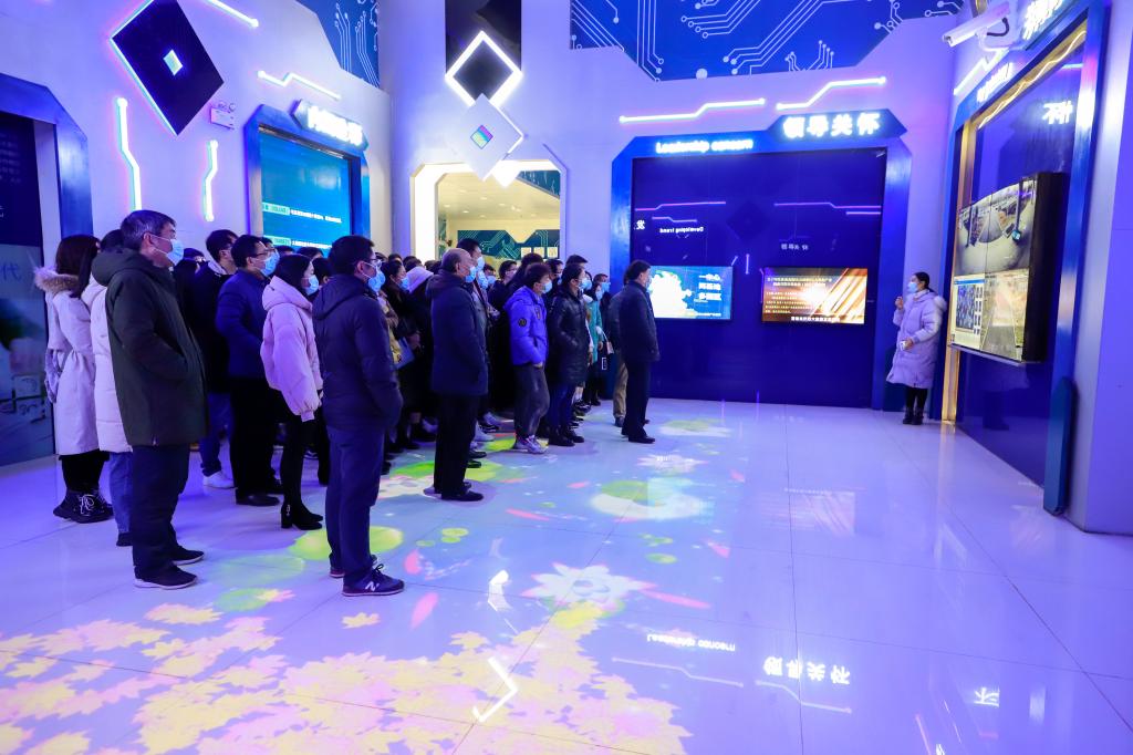 在解说员的带领下,师生党员们参观了开发中心的各个展厅,感受到了大数据应用的广阔前景。展厅中包含了很多益智趣味的展区,如幻境的时空隧道、极其便利的生活云亭,煤矿井下VR工作面真实体验以及虚拟骑行,还有便民的服务展区,如社区自助体检、水电缴费自助、话费自助……,同时中心还具有监测和分析的功能,可以实时显示全国航班信息以及实时监控淮南若干乡村燃烧麦秸秆的情况等等。