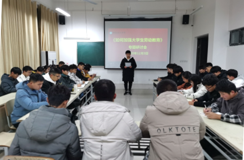 大力弘扬劳动精神,增强学生劳动观念。2020年秋季学期学生返校以来,学院通过专题研讨、主题班会、学生座谈会等多种途径,了解掌握学生思想动态,听取学生对开展劳动教育的意见、建议。各年级辅导员线上线下大力宣传弘扬劳动精神、劳模精神、工匠精神,让学生感受到扎根基层一线、平凡劳动亦能创造伟大,引导学生畅谈感想、体会,激发学生脚踏实地从事劳动、辛勤劳动、诚实劳动、创造性劳动的自觉性和主动性,内心真正以“不劳而获”为耻,切实增强学生对劳动价值的认同感。