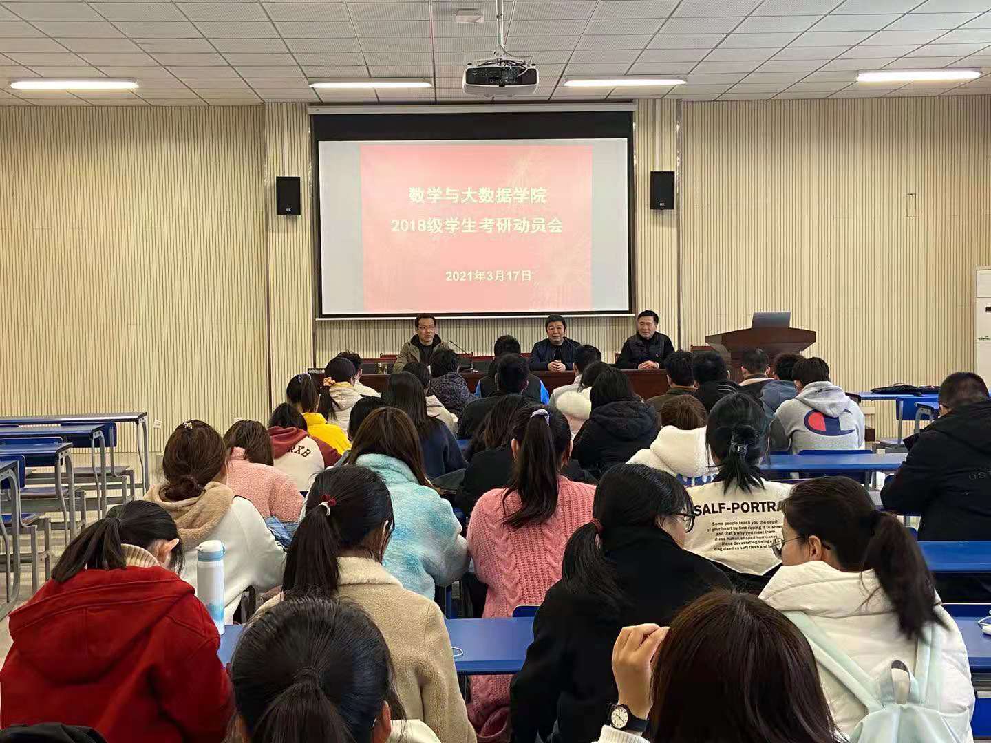 3月17日中午,数学与大数据学院在学院一楼报告厅召开2021年考研动员会。院长赵前进、院党委副书记李勇、副院长李德权及2018级辅员、2018级全体学生参会。会议由李勇主持。