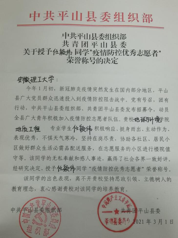 “该同学的出色表现,离不开贵校坚持思政引领、立德树人的教育理念,衷心感谢贵校对该同学的培养教育。”近日,河北省平山县县委组织部、共青团平山县委对我校地球与环境学院地质工程专业学生任颖伟授予“疫情防控优秀志愿者”荣誉称号。