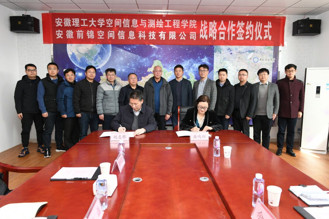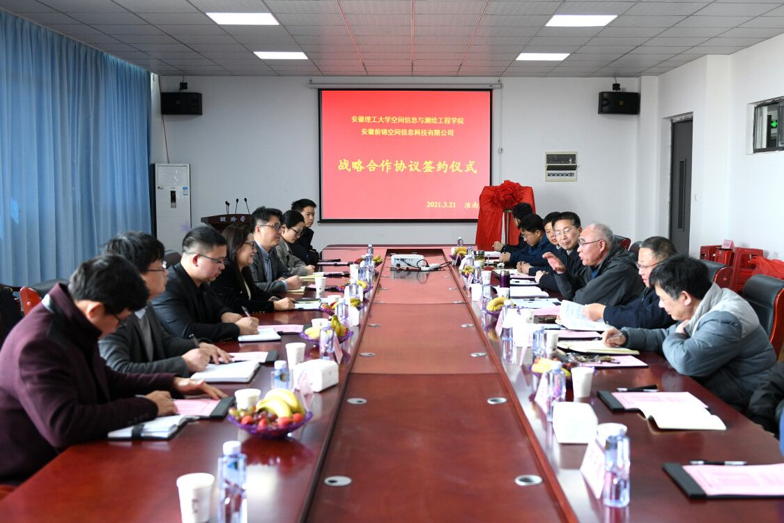 3月21日下午,空间信息与测绘工程学院与安徽前锦空间信息科技有限公司战略合作协议签约仪式在求本楼北503会议室隆重举行。副校长郑明东出席会议并讲话。学院领导、教师代表参加会议。签约仪式由学院党委书记吴军主持。