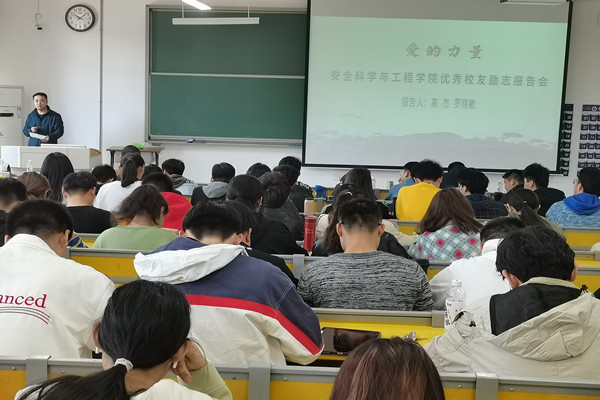 4月9日上午,安全学院优秀毕业生、山西金晖万峰煤矿有限公司副总工程师高杰、罗晓敏夫妇,应邀作了题为“爱的力量”励志事迹报告。报告会在天工南316教室举行,由安全学院党委副书记金德主持。