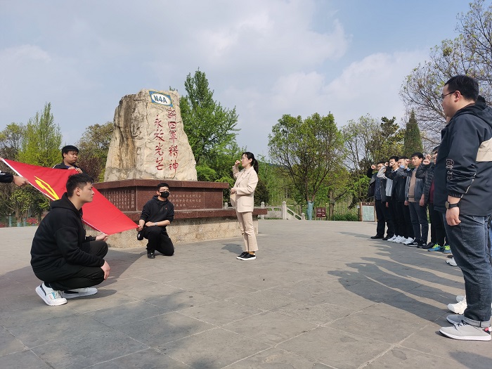 大家驻足在纪念碑前,默念着碑座下方的“新四军精神”,看着背面的新四军简介,回顾着新四军浴血奋战的光辉历程,在鲜红的党旗、团旗面前,重温入党誓词和入团誓词。历史厚重的红色遗迹投射出革命精神和报国情怀,身心投入的“浸润式”学习教育让大家有了更多的收获。
