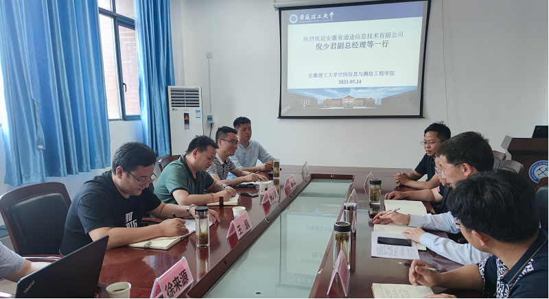 5月24日下午,安徽省通途信息技术有限公司副总经理倪少君、洪飞等一行5人来空间信息与测绘工程学院交流,学院领导热情接待了倪少君一行,双方在学院楼南502会议室召开项目洽谈会。