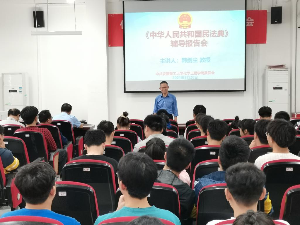 5月26日下午,化学工程学院在102教室开展“典”亮生活《民法典》宣讲活动,邀请马克思主义学院教授韩剑尘为师生作宣讲报告,并现场互动交流。学院师生代表120余人参会,学院党委书记王大贤主持报告会。