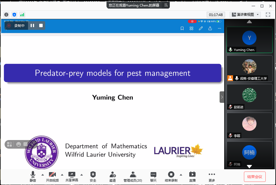 5月27日上午,应自然科学处、国际交流与合作处和数大学院的邀请,加拿大西安大略大学邹幸福教授和罗瑞尔大学陈玉明教授通过腾讯会议分别作了“Fear effect in predator-prey interactions”和“Predator-prey models for pest management”的学术报告。院长赵前进教授主持了报告会,学院青年老师和研究生30余人聆听了学术报告。