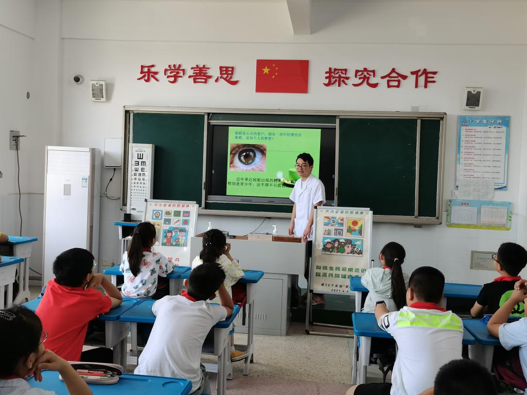 6月6日是我国第26个全国“爱眼日”,为庆祝中国共产党成立100周年,积极践行“我为群众办实事”,6月4日上午,校医院直属党支部和总务部部分党员,以及校第一附属医院眼科团队医务人员到校附属小学开展全国“爱眼日”宣传活动。