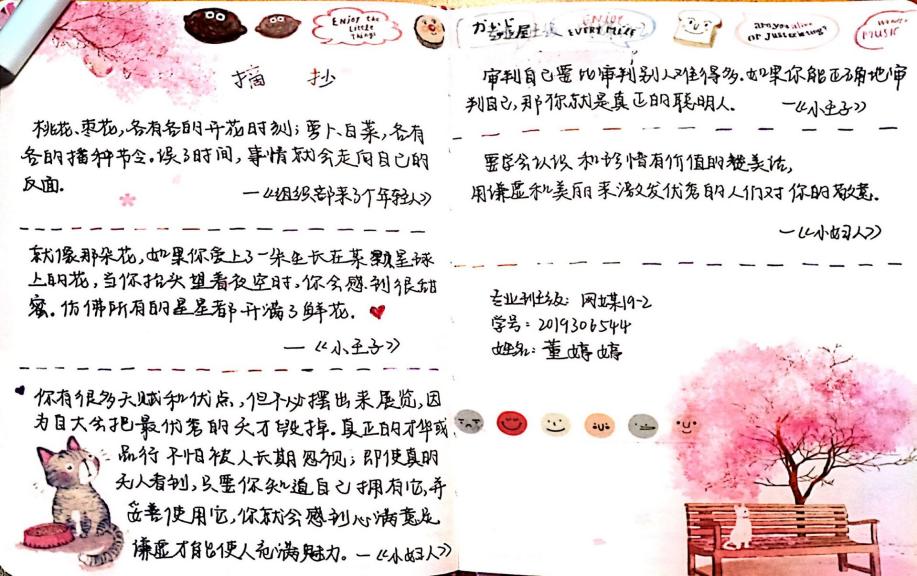 在与“读书漂流”同期举办的“书话人生”经典语录摘记活动中,同学们用钢笔、毛笔等手写方式,摘记下阅读经典书籍中感触最深的段落语句。在综合考量摘记内容文学价值、笔迹美观程度后,共评选出五位获奖学生:网媒19-2班董婷婷获得一等奖,社工20-1班刘梦吉、网媒20-3班徐意获得二等奖,政行20-1班储诚沛、社工20-1班王嘉玲获得三等奖。