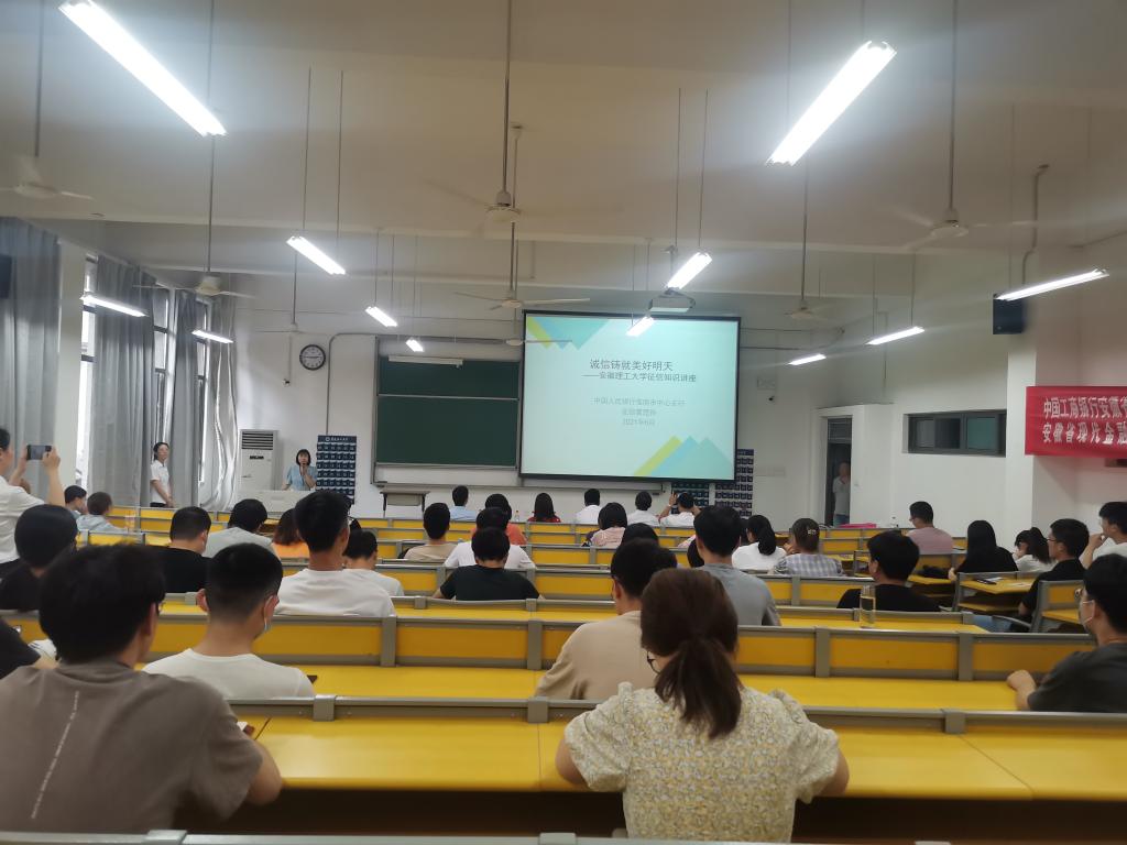 6月10日下午,由校学生处、中国人民银行淮南中心支行、中国工商银行淮南分行共同举办的“学党史明初心讲诚信促发展”主题教育活动在明理北楼112教室举行。