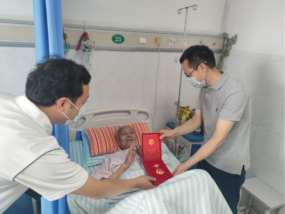 在医院,谢中根代表部党委把金灿灿的“光荣在党50年”纪念章送到袁翠萍手里,身患重病的袁翠萍激动地反复说到:“我一心向党,永远跟党走”,老党员寥寥数语,却深切表达了对党的坚定信念和不渝初心,表达了对共产党员这一光荣身份的高度认同和衷心追随,使在场党员无不为之感动。谢中根还关切地询问了老党员的病情和身体状况,并送上了慰问品、慰问金等,叮嘱她安心养病,争取早日康复。