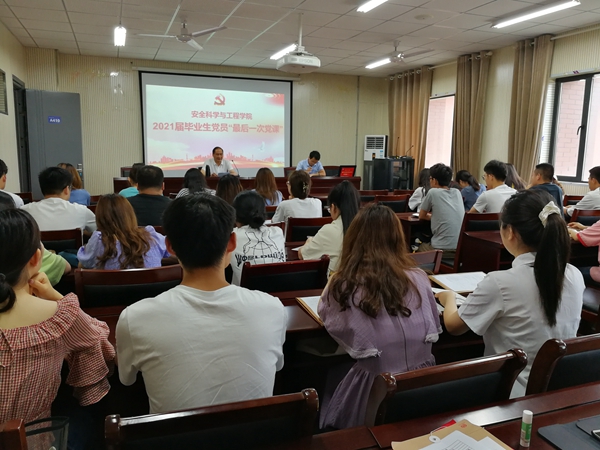 6月18日上午,安全科学与工程学院在宁远楼A410报告厅召开党史专题宣讲会暨毕业生党员“最后一次党课”。学院党委书记华心祝主讲,学院2021届全体毕业生党员聆听了党课。会议由学院党委副书记金德主持。