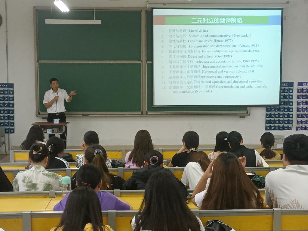 在“新时代我国应用翻译策略:理论与实践”讲座中,傅敬民教授介绍了关于翻译策略的几种界定,与师生讨论了翻译策略的具体特征及分类,并结合代表性翻译家探讨翻译策略,指出了传统翻译策略的局限,并结合皮姆的七种翻译策略,探求它们对于中国文化外译的理论和实践意义。他强调,翻译策略是一个复杂的理论及应用性概念,它因问题而起,以实现翻译目标为旨归,受到翻译规范等制约。