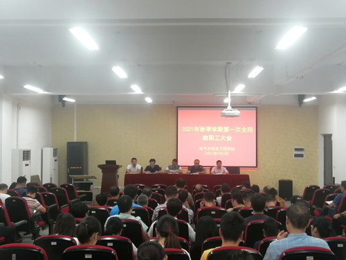 9月3日下午,电气与信息工程学院在励行楼B112报告厅召开全院教职工大会,集中传达学习学校2021年度重点工作推进会议精神,总结学院暑期工作并部署新学期工作。会议由学院党委副书记、院长周孟然主持。