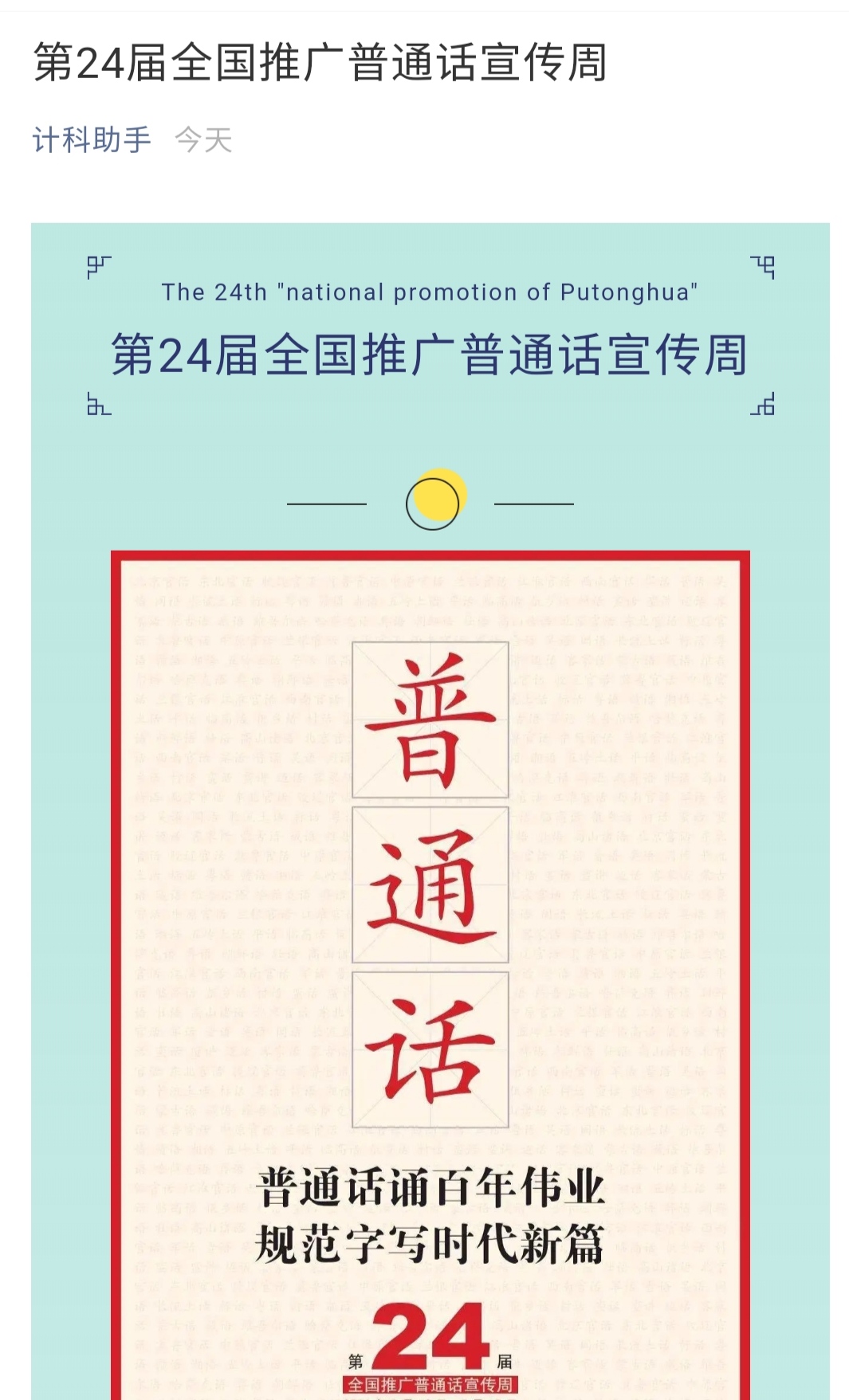 9月12日,学院通过计科助手、易班等平台发布了宣传语言文字、推广普通话等宣传语,以迎接第24届全国推广普通话宣传周。推广普通话,对于消除语言隔阂、增进人际沟通、促进社会发展都具有非常重要的作用。通过线上宣传使师生们对中华民族悠久的历史文化有了更进一步的了解,全院师生的推普热情高涨,也营造了浓浓的文化氛围。