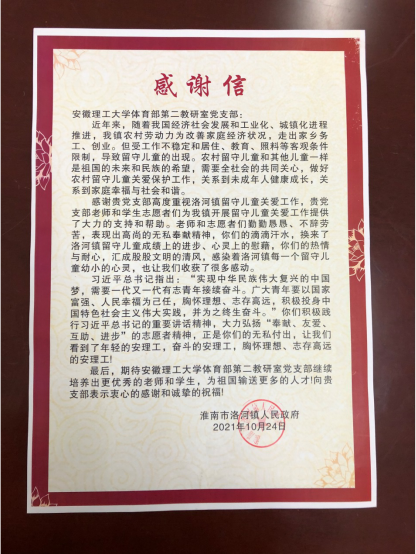 11月12日,淮南市洛河镇副镇长杨山、关工委主任杨多祥、团委副书记朱蕴怡一行专程来到体育部第二党支部,送来了“弘扬志愿者精神 展现大学生风采”锦旗、感谢信及志愿者纪念证书,表达了洛河镇政府对体育部第二党支部在关爱农村留守儿童工作中倾心倾力帮扶的诚挚感谢并开展座谈。
