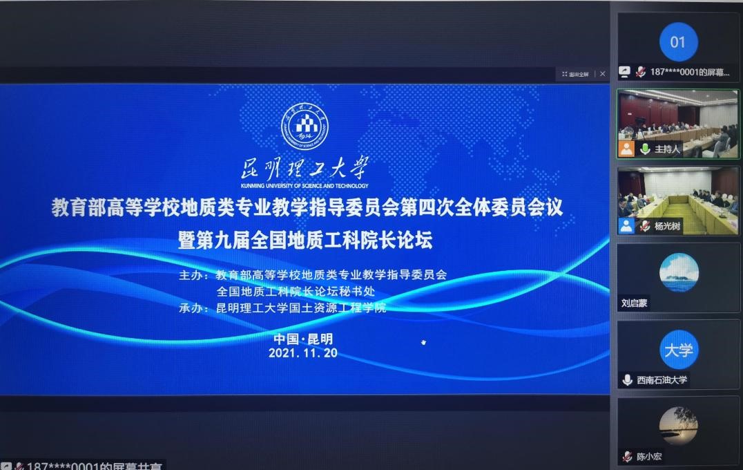 11月20日,教育部高等学校地质类专业教学指导委员会第四次全体委员会议暨第九届全国地质工科院长论坛在昆明理工大学召开。受疫情影响,本次会议采用线上线下相结合的方式。教育部高教司、中国地质教育研究分会领导,地质类专业教学指导委员会委员以及全国各高校地质学科院长、系主任等近150人参加会议。地球与环境学院组织地质类专业骨干教师在静远楼B414会议室参加了线上会议。