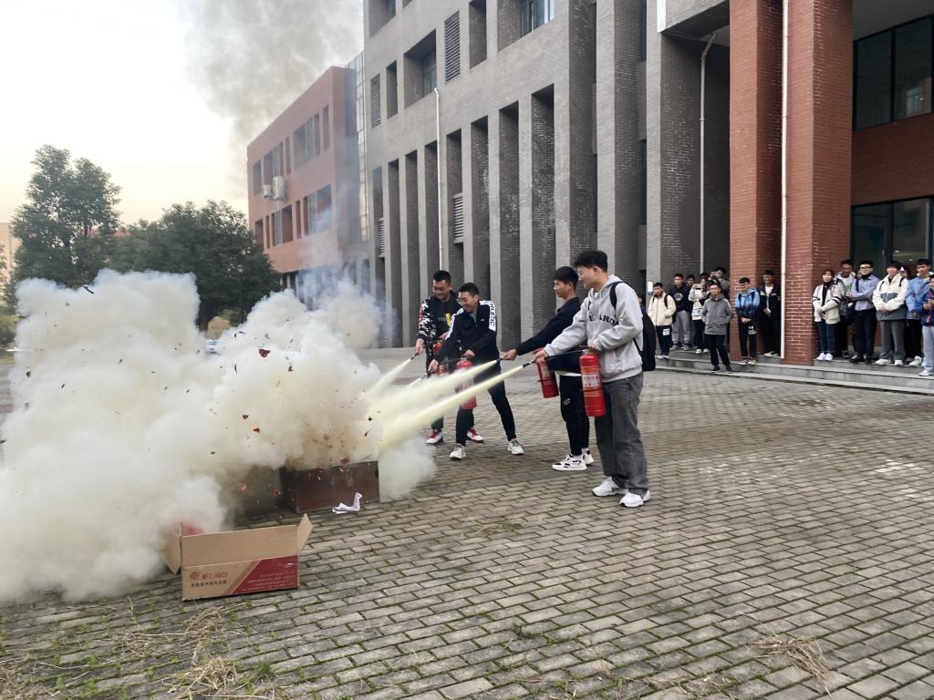 讲座结束后,土木建筑学院还在求是楼进行了应急疏散逃生演习和室外实地灭火演练。彭广峰向现场师生员工讲解了干粉灭火器的操作方法并示范。师生代表分组分批亲身体验,扑灭火槽明火。
