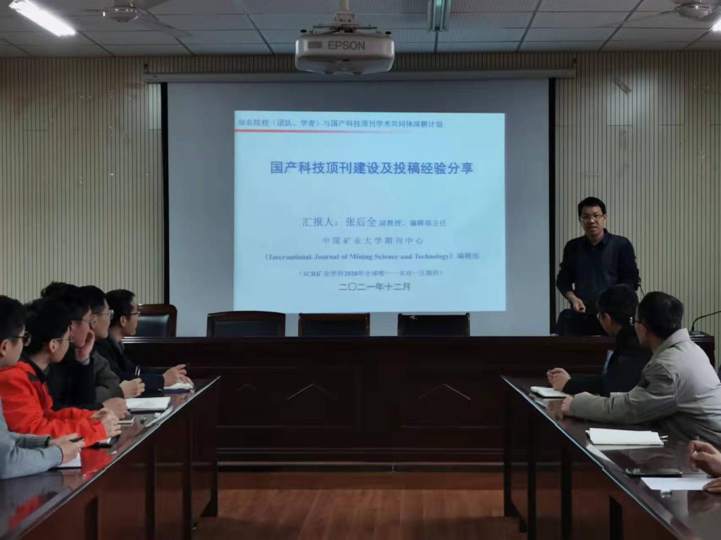 1月11日下午,矿业工程学院在宁远楼410会议室举行专题报告会,邀请中国矿业大学期刊中心编辑部主任张后全副教授为学院师生作题为“国产科技顶刊建设及投稿经验分享”的专题报告。矿业工程学院副院长殷志强教授主持报告会。矿业工程学院部分教师和全体研究生参会。