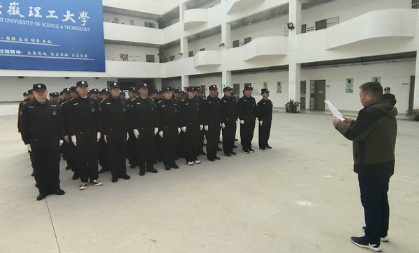 刘训强首先代表学校对全体新任保安员表示欢迎,并就学校的基本情况进行了介绍。他要求新任保安人员把尽职履责作为入职的“第一粒纽扣”扣好,工作中一定要有责任、有担当,努力在平凡的岗位上创造出不平凡的业绩;要自觉树立安保队伍的良好形象,提高自身素质和业务能力,全力打造一支专业、精干的安保队伍,努力使师生满意、学校放心;要严格贯彻执行学校各项规章制度,认真做好常态化疫情防控工作,严格控制无关人员、违规车辆进入校园;要主动适应“新常态”下校园安全形势变化,扎实做好校园安全保卫工作。