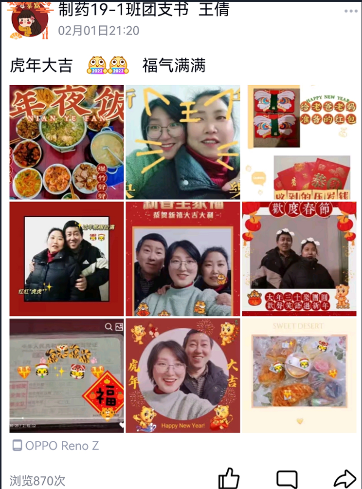 制药21-1班李文卓积极参加村委会组织的剪纸活动,在老师傅的指导下,作品颇有创意,剪“萌虎”时巧妙地插入字,剪字时又化形为动物形象,造型生动活泼,让人眼前一亮。能化21-2班李秉晨自己动手写春联、贴春联,将年味带入家中,将文化融入生活,把春节文化内涵展现的淋漓尽致。假期中,学生们还用心观察生活,拍摄迎新春照片、家乡新年影像,捕捉新年的喜悦,提高了审美情趣和人文素养。