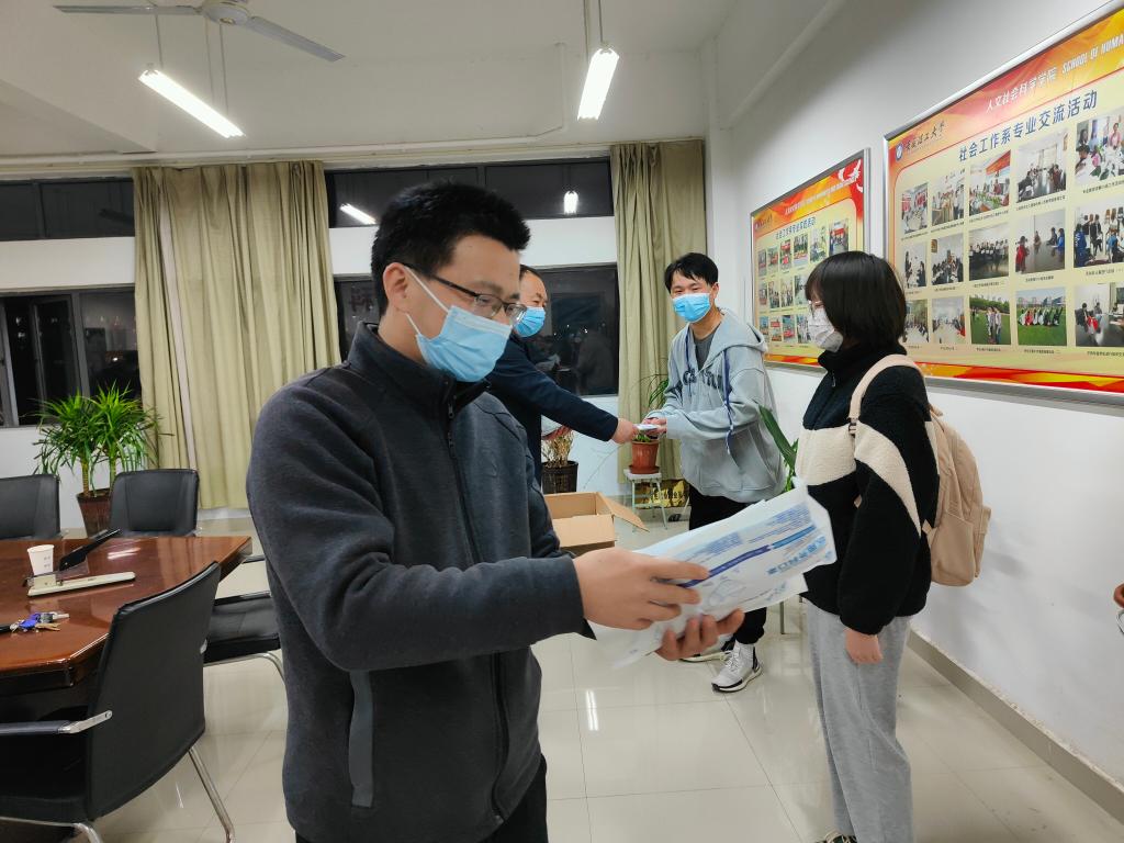 学院关心学生,掌握思想动态,解决实际问题。辅导员及时深入学生宿舍了解学生的思想动态,在这一特殊时期,摸排和帮助解决学生的困难和问题,共征求意见和建议6条,帮助1名学生解决特殊困难。针对特殊学生因疫情不能外出买药,辅导员、学院领导、学生处老师、第四医院领导和医生,多方合作,4月1日,终于将学生需要的药品及时送到学生手中,解了同学们的燃眉之急,排除了可能存在的隐患。当前疫情防控形势严峻复杂,校园疫情防控处于关键时期,为筑牢校园疫情防线,守护师生安全,4月1日晚,人文学院为在校师生发放防护口罩8千余个。为师生购置饭盒900个。口罩发放过程中,组织有序,保持安全距离。班级同学表示:“学院发放防护口罩的行动非常及时、暖心,让同学们感受到了人文大家庭的温暖与关爱。”
