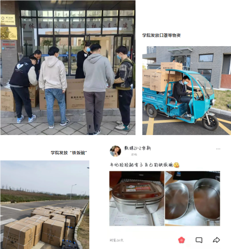 为保障教学工作的有效进行,学院为学生们提供了口罩、饭盒等物资,保障同学们的正常生活,解决同学们的后顾之忧,助力教学工作的平稳有序开展,同时,学生们的日常分享也暖人心。