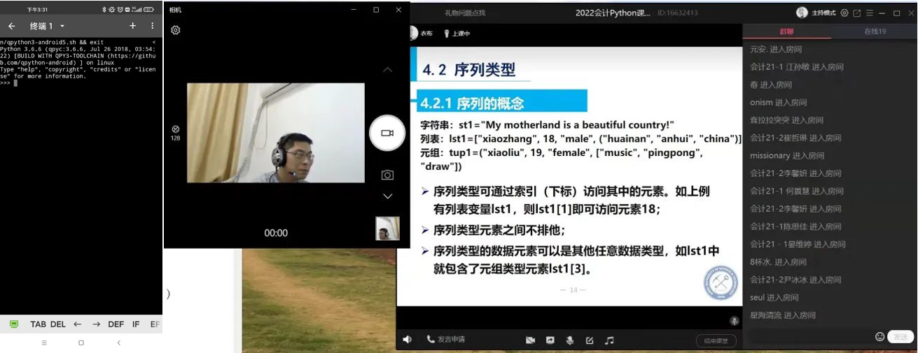 梁兴柱老师使用腾讯会议设置时间签到,保证学生重点内容不错过;蒋社想老师通过腾讯课堂发起线上研讨,保证上课质量;刘惠临老师针对部分同学没有电脑的问题,利用手机端的python编辑器指导学生进行编程。不仅解决了学生实际问题,又提高了学生对计算机的兴趣,切实给同学们上了一次生动的实践课。