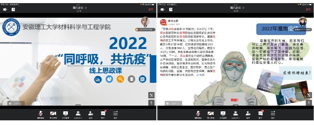 为引导学生弘扬伟大抗疫精神,发挥学生干部的思想引领作用。4月5日,学院举办了以“同呼吸,共战疫”为主题的学生线上思政课。复合材料与工程2021-1班秦紫耀和矿物加工工程2018-2班何海陵分别从学生的视角分享了闭环管理中青年学生如何严守疫情防控要求和做好线上课程学习,将思政课由“大”化“小”,为同学们讲述了一堂特殊而又鲜活生动的思政课。