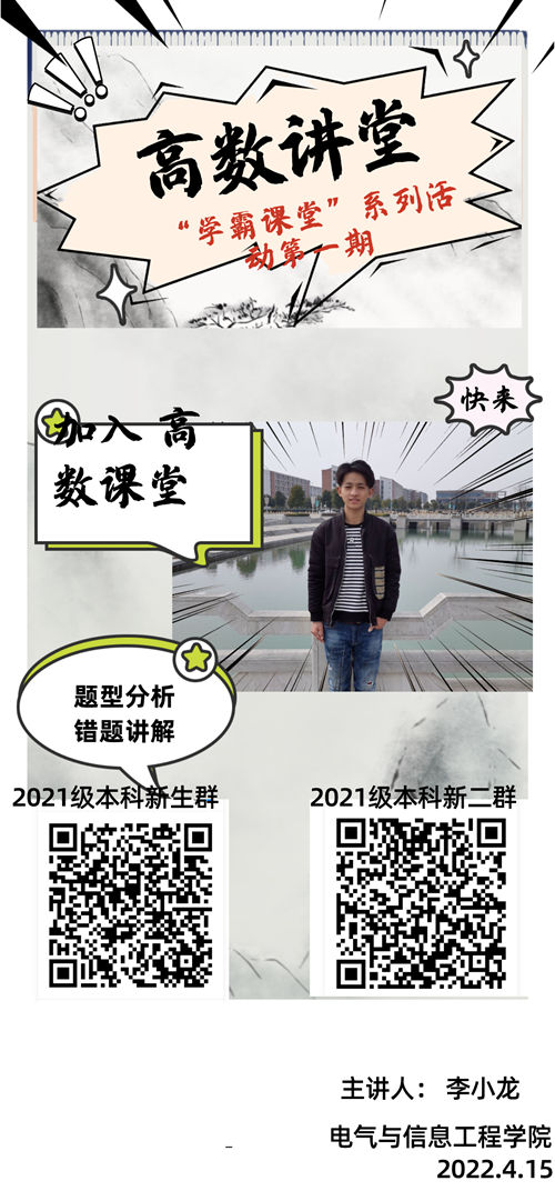 在学校封闭管理期间,为拓宽学生在线学习渠道、延伸学习阵地,进一步激发同学们的线上学习热情,营造良好的学习氛围,电气与信息工程学院于4月15日晚举办了“学霸课堂”系列活动第一期:高数讲堂。本次学霸课堂由2020-2021学年校数学明星奖(全校唯一)获得者、电信学院的李小龙同学主讲,吸引近千名大一学子参加。