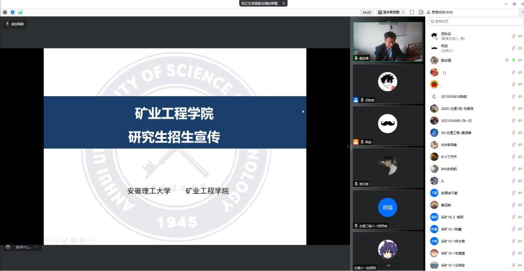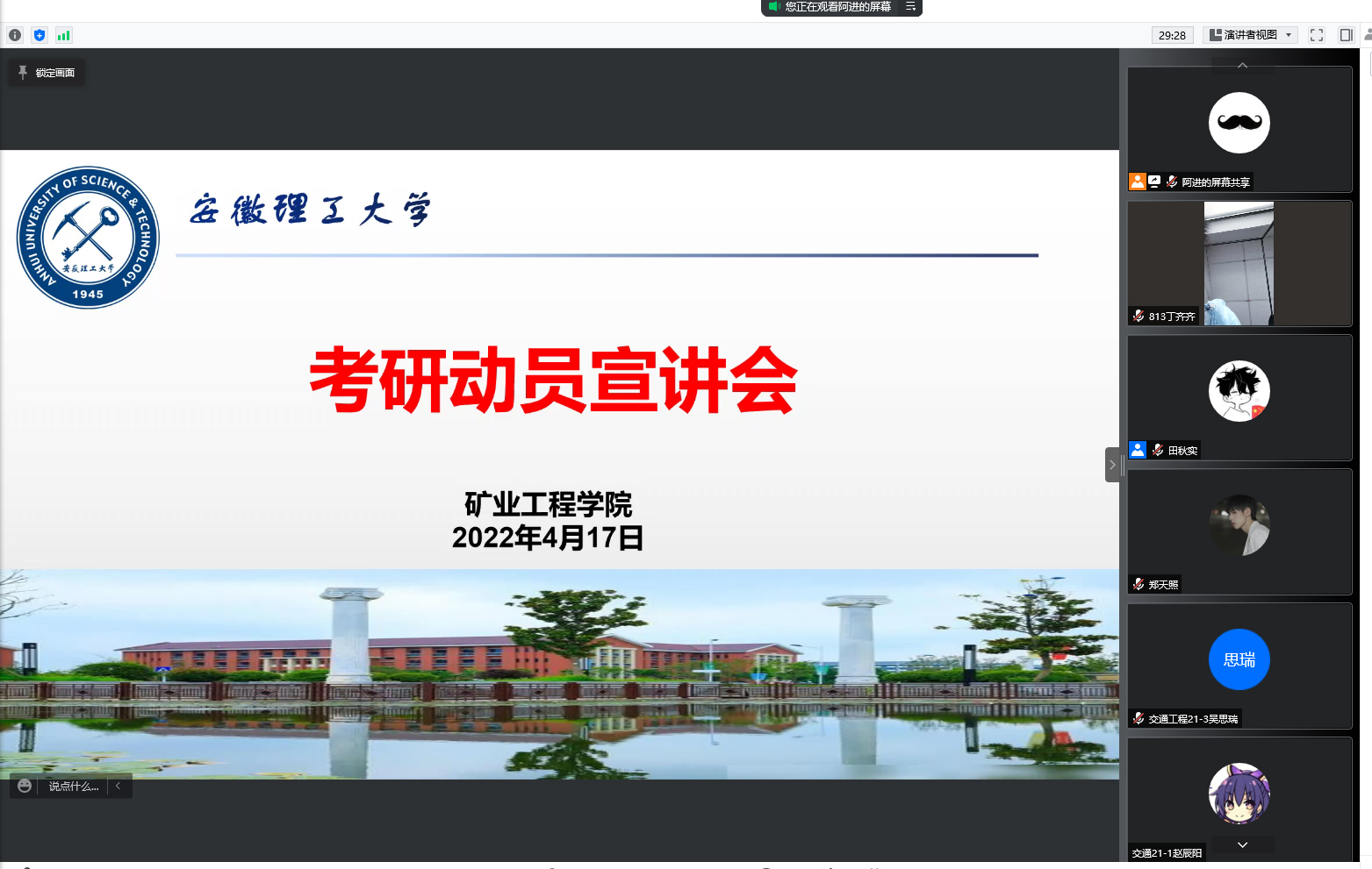 “古之立大事者,不惟有超世之才,亦必有坚忍不拔之志。”考研逐渐成为越来越多大学生的选择,为帮助同学们明晰考研形势,把握备考节奏,4月17日上午,矿业工程学院组织召开线上考研动员宣讲会。学院院长杨科、副院长殷志强、全体辅导员以及各年级学生400余人参加会议。党委副书记田秋实主持会议。