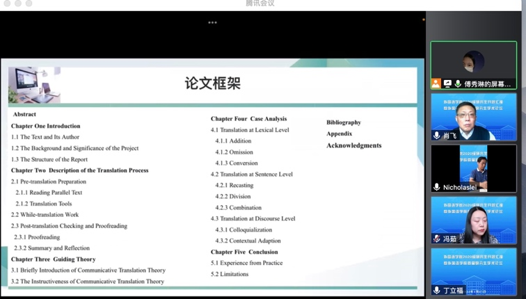 为进一步营造学术氛围,提高研究生培养质量,4月27日下午,外国语学院以线上会议方式召开2020级研究生开题汇报会暨外国语学院首届研究生学术论坛活动。安徽大学朱跃教授,我校特聘教授、南京林业大学肖飞教授,淮南师范学院方秀才教授、丁立福教授等特邀专家出席。论坛由外国语学院副院长周宁主持,学院全体硕士生导师及研究生共计60余人参加论坛。