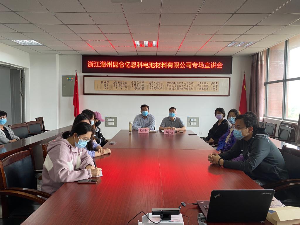 浙江湖州昆仑亿恩科电池材料有限公司人事负责人陈淑霞对企业背景、企业概况和招聘岗位作了相关介绍,公司的合成和研发部门负责人对新能源材料的合成、研发、专利申请、行业发展和公司发展战略作了详细解答。学院2012届校友、公司销售总监单晓峰分享了个人在公司的工作和成长历程,对企业培养模式、企业文化建设、人才发展路径、薪酬待遇、招聘流程以及当地政府的就业政策进行了详细介绍,并发出诚挚邀请,期待学弟学妹们的加入。