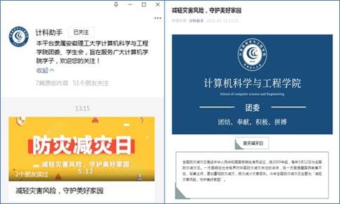 5月10至12日,学院发动各年级安全信息员深入宿舍开展防灾知识宣传,组织低年级学生进行防灾减灾学习讨论,并利用微信公众号推送防灾减灾推文,切实增强学生防灾减灾意识,提高学生自救互救能力。