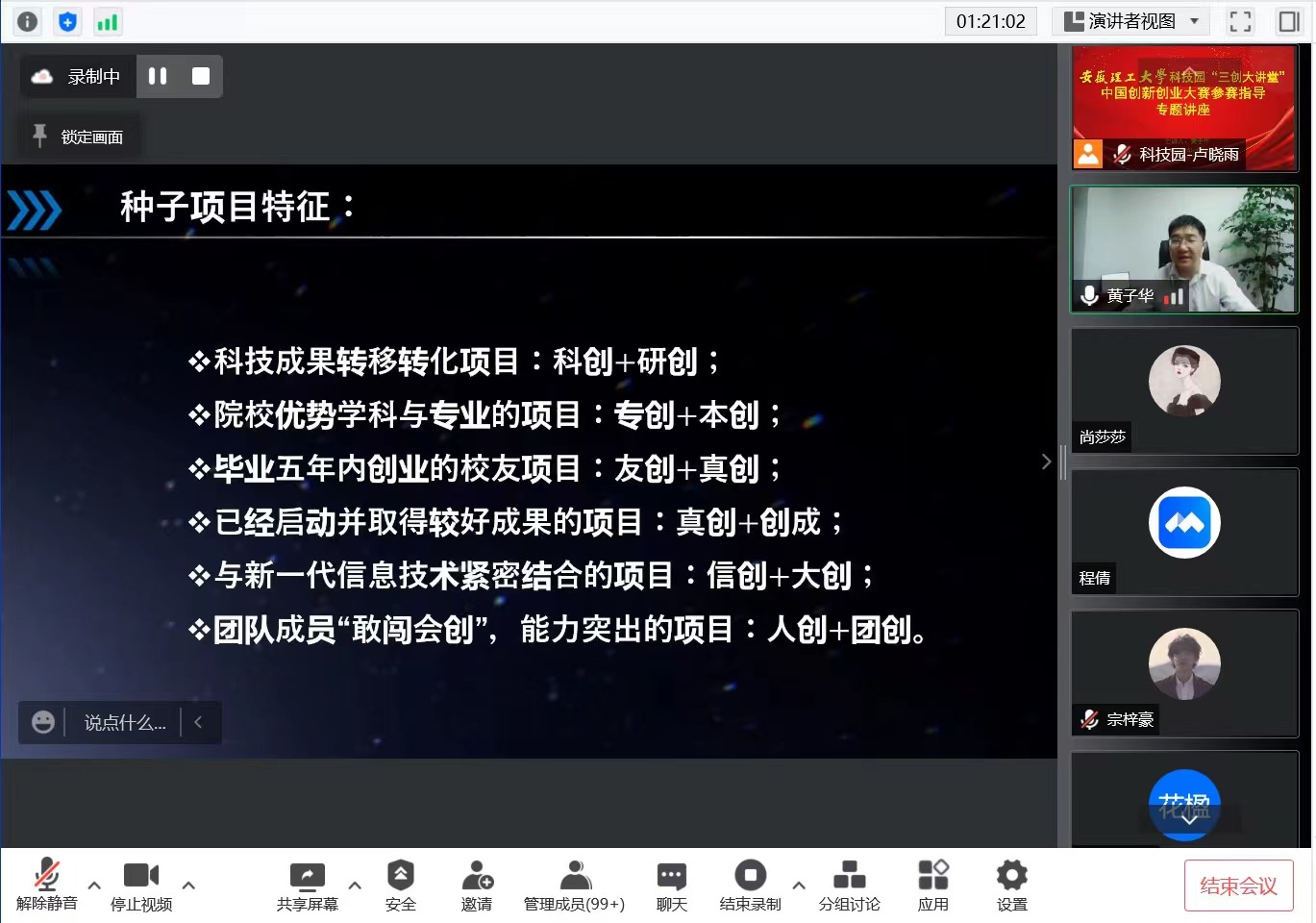 5月13日,由大学科技园和教务处(创新学院)联合主办的首期《“三创”大讲堂》通过腾讯会议顺利举行,会议由大学科技园总经理黄绍服主持。本期授课主题是《中国创新创业大赛参赛指导》,特邀中国青年创业导师、教育部就业创业专家指导委员会委员、中国国际“互联网+”创新创业大赛国赛评委、重庆云日集团董事长黄子华博士担任主讲,来自我校大学科技园创业团队、不同专业学生近260人参加了本次讲座。