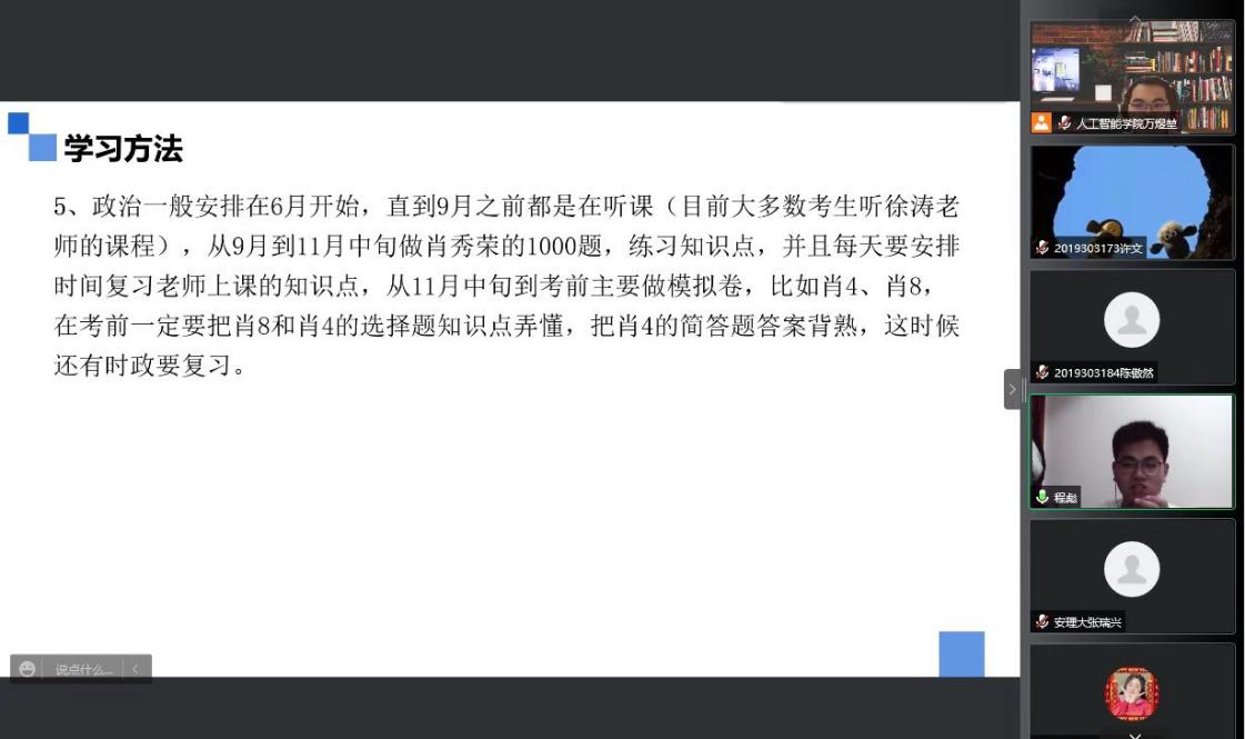 5月12日晚,人工智能学院第一期大学生“学习能力训练营”之考研经验分享会成功举办。学院副院长凌六一和人工智能学院6名2022级准研究生为2019级本科生就考研准备进行了线上分享交流。分享会由学院党委副书记张瑞兴主持,学院班子成员、辅导员参加了会议。