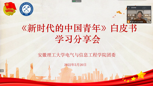 5月20日,电信学院开展《新时代的中国青年》白皮书学习分享会。本次活动通过云端直播形式组织全院团员青年们一起参与。会上,大家共同观看了国务院新闻办公室发布《新时代的中国青年》白皮书新闻发布会视频。学院学生会主席王绍圳结合白皮书内容带领团员青年们进行了精读研学。大家在“云”端积极讨论,结合自身实际,深入思考并分享了各自学习的感悟体会。自动化21-6班团支部书记李玉婷表示,通过学习《新时代的中国青年》,更加清楚地认识到新时代青年应承担的历史责任。我们生逢盛世,我们身肩重任,必将大有可为,必将大有作为。我一定明确自身定位,自觉扛起责任,心系同学,无私奉献,将服务同学体现在做实事上。