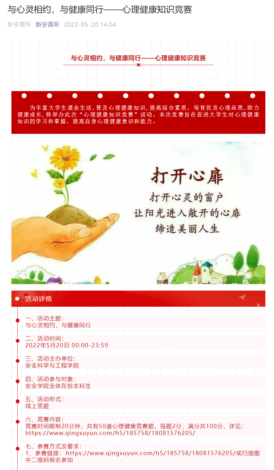 5月20日,学院在“新安青听”公众号上举办线上心理健康知识竞赛。通过竞赛帮助同学们学习掌握心理健康知识,提高同学们自身心理健康意识和能力。竞赛评选出一等奖5名、二等奖10名、三等奖20名。