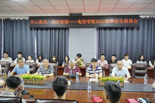 6月4日下午,电信学院关工委王清灵、胡光厚、杨斌三位老教师在B407报告厅与2022届毕业生亲切座谈。学院党委书记徐关怀,党委副书记、院长周孟然,党委副书记唐克,毕业班辅导员和30多名毕业生代表参加了座谈会。