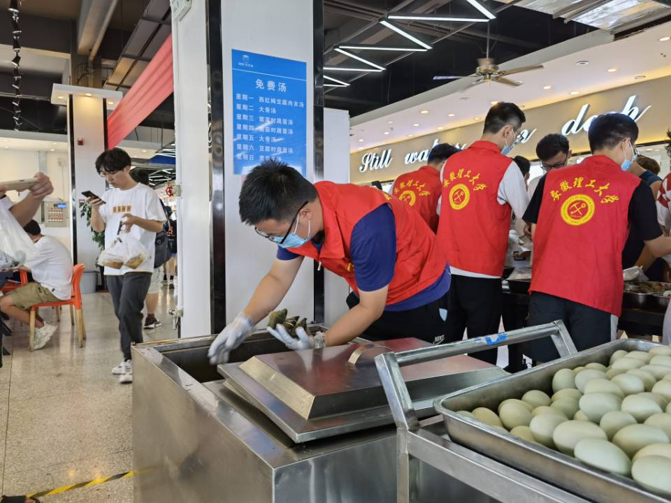为提升毕业生党员的志愿服务意识和奉献精神,6月3、4日中午,力物学院学生党支部开展党员志愿者食堂帮扶活动。毕业生党员统一穿着志愿者红马甲,在义苑食堂就餐大厅参与服务工作。他们不畏炎热天气,在收残柜台收拾碗盘,清洁桌椅和地面等,并引导师生遵守食堂秩序,文明就餐。在就餐高峰期间,他们提醒师生间隔就坐,落实光盘行动,展现了“我为群众办实事”的党员风采。