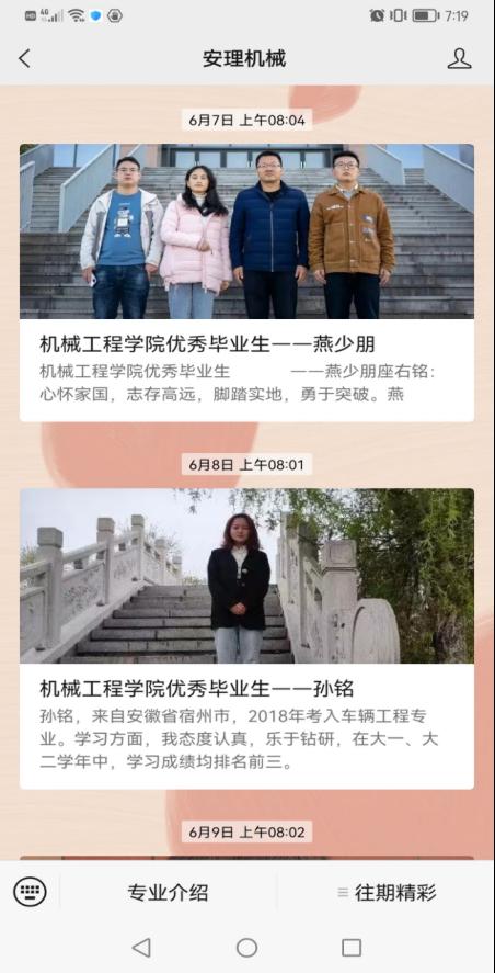 5月-6月,学院开展优秀毕业生风采展示活动,通过“安理机械”微信公众号推送优秀毕业生的事迹,树立榜样力量,让低年级学生聆听他们的精彩故事,学习他们的优秀精神品质,帮助更好成长成才。
