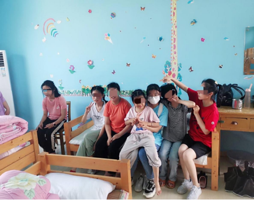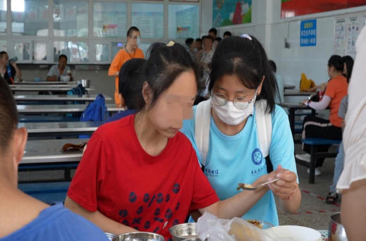 在学生食堂,尽管已是炎炎夏日,食堂环境卫生干净。荤素搭配,分量也非常实在。大部分孩子可以独立就餐,一部分智力障碍孩子由生活老师负责喂饭。有一位非常热情的小女孩,拉着志愿者的手,邀请坐下来一起用餐。还有一位比较胖的孩子,吃完饭趴在桌子上睡着了,其他孩子看到后主动叫醒他,将他拉到宿舍去,害怕他着凉感冒了。