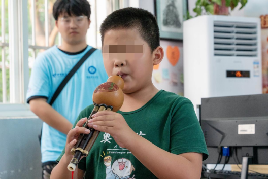 在盲七班,全体孩子们倾情演唱了歌曲《这世界那么多人》,并表演了葫芦丝作品《月光下的凤尾竹》,那悠扬的旋律和动听的歌声,不禁感染着每一位在场成员的心。“这个同学葫芦丝已经通过了十级,这可是最高级别。”带班老师热情洋溢地介绍那位同学的情况,自豪感油然而生。