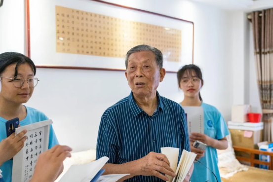 特殊教育事业不同于一般教育,属于公益性和非盈利性,除了政府大力支持外,还需要社会各界的大力支持。6月23日上午,实践团队拜访了特殊教育中心艺术顾问郭大华先生。郭大华先生如今已是89岁高龄的老人,是中国书法家协会会员、中国诗词学会会员,担任安徽省老年书画副院长一职。在与团队交流过程中,他特别说到:“书法是为社会服务的,要把民生放在心中。”他心系特殊教育事业,多次来到宿州市特殊教育中心,为孩子们捐赠字画和书籍,以实际行动培根筑魂,多给予孩子们一些温暖,让孩子们对书法产生浓厚兴趣。他坚持守正创新,作为一名退休的党支部书记,以书法知识传授党课,始终不忘初心,坚持学习。除了郭大华老师,宿州市特教中心得到了爱心大使毛乐乐、王珊夫妇、宿州市鸿正服装服饰有限公司董事长尹正岁等一大批爱心人士的鼎力支持。