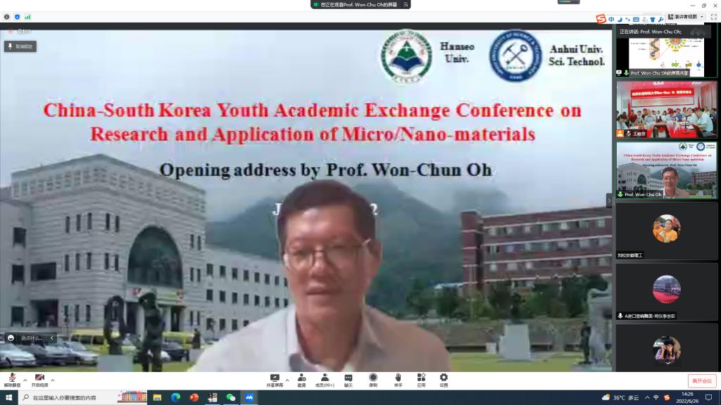 6月26日下午,由安徽理工大学材料科学与工程学院、韩瑞大学先进材料科学与工程系、安徽省纳米碳基材料与环境健康国际联合研究中心共同发起举办的中韩微纳米材料研究与应用青年学术交流会顺利召开。本次交流会围绕“Macro and Nano Based Materials and Application: Basic synthesis, Electronic, Environmental and Biomaterials”主题展开,来自韩瑞大学、安徽理工大学材料学院的教师、研究生及部分本科生,共150余人以“线上+线下”的方式参加了会议。
