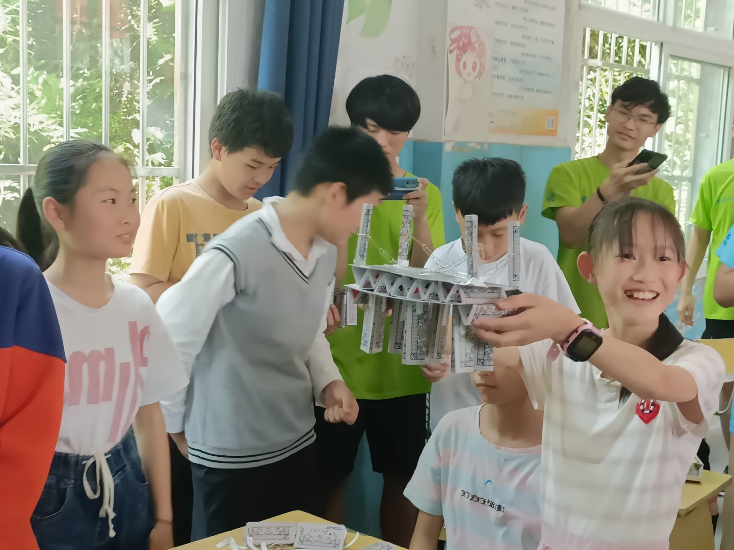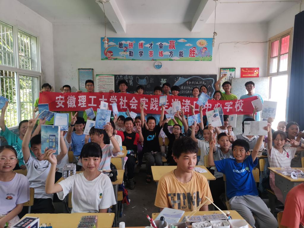 助力青春。从华丽的都市到发展中的小城,穿越河谷山林,驶进乡村小路,一路颠簸,团队到达活动第二站——渚口中心小学。在那里,志愿者和小朋友们进行“滴水成冰”科普小实验,增加他们对科学的兴趣;他们带领小朋友一起奇思妙想,开展纸牌搭桥活动,通过灵巧的双手将一张张纸牌搭建起一座桥梁。在造桥过程中,向小朋友讲解其中的力学原理,帮助他们更好地理解物理知识。